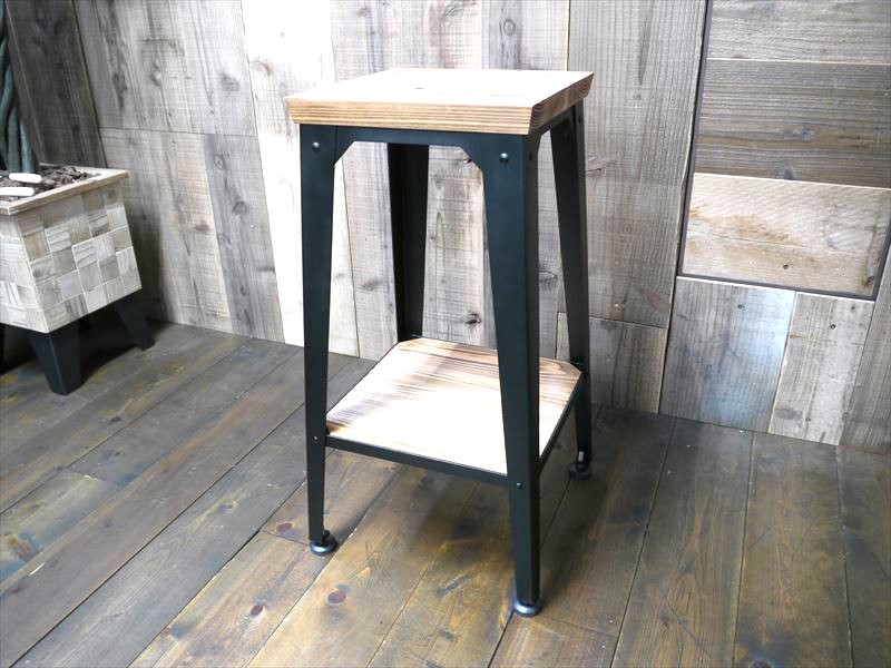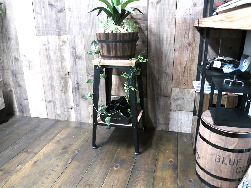 ・斜めカットのエル脚に無垢杉材を組み合わせ、リベットピンをポイントに施したカウンターチェアです。ちょっと一息の腰掛は当然のことながら「植物を乗せる台や雑貨等の飾り台」としてもかっこよく決まるインダストリアルな製品になっています。